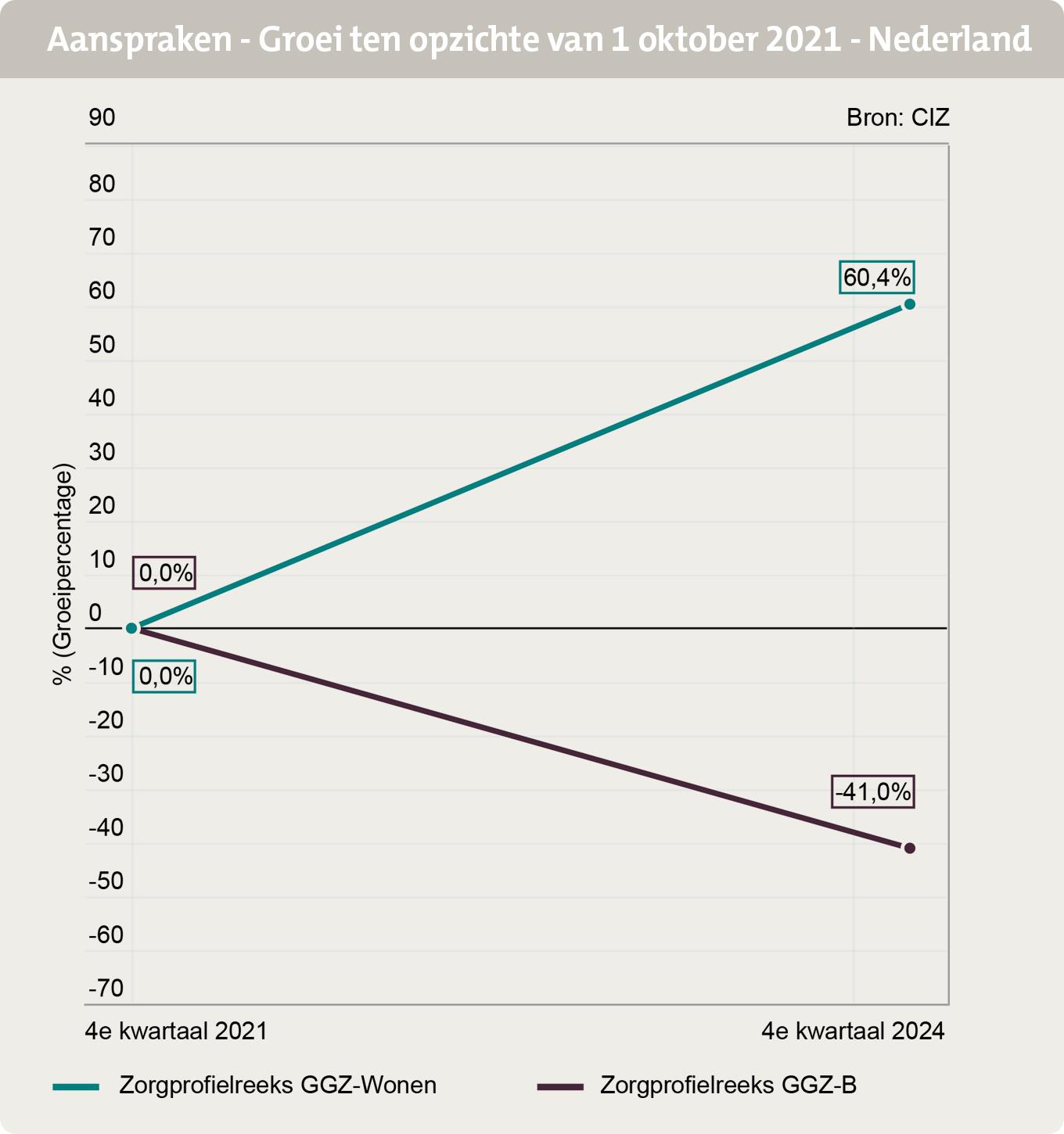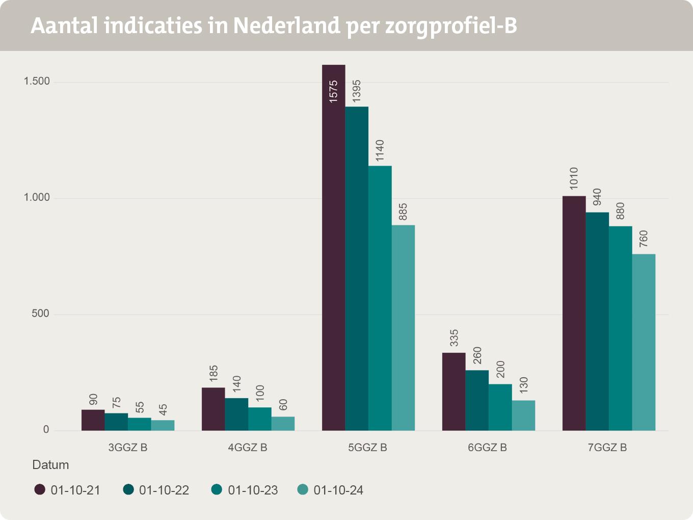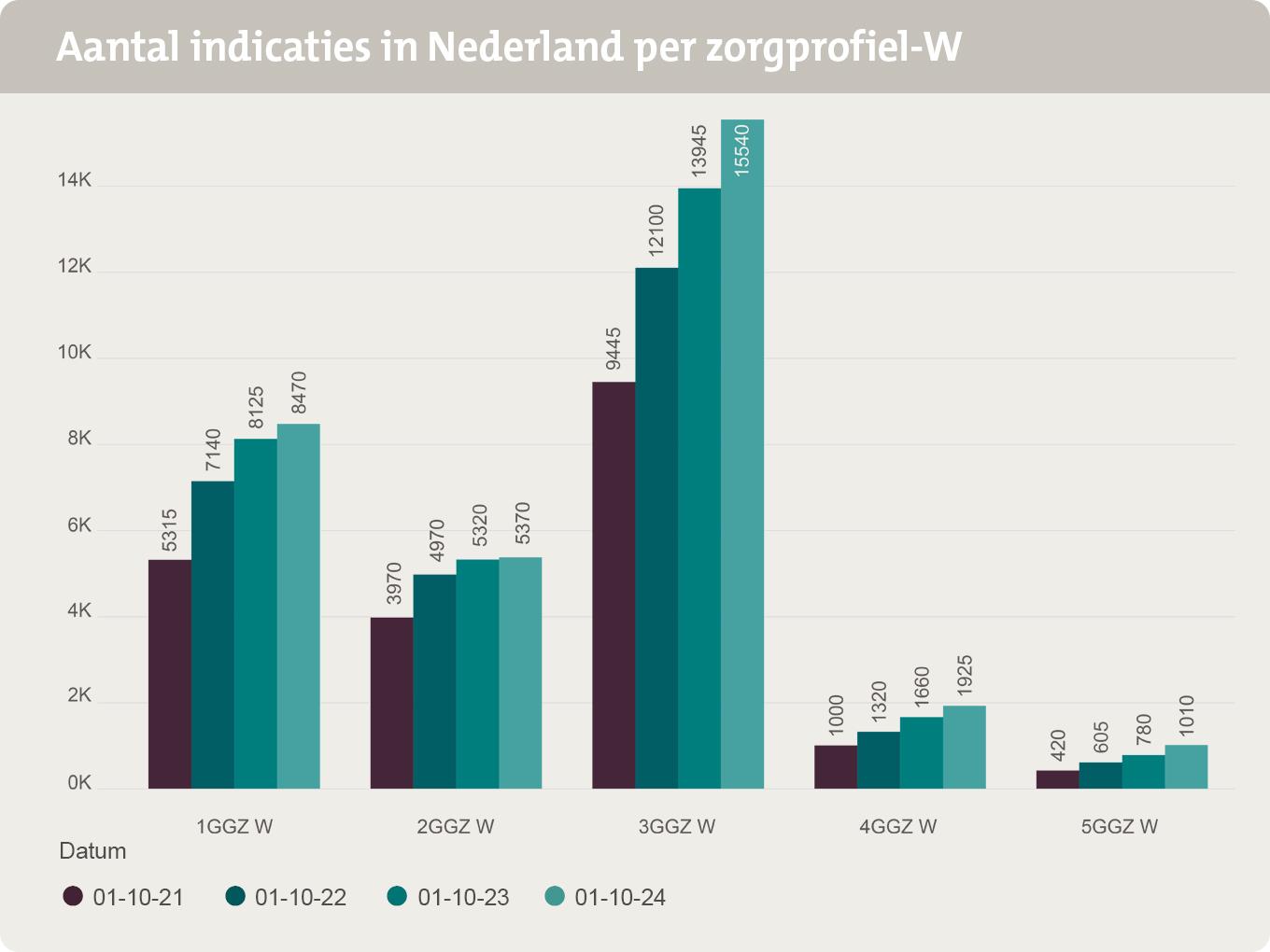 Tussen de periode 1 oktober 2023 en 1 oktober 2024 is in de landelijke cijfers een stijging van 8.33% te zien, in het aantal aanspraken tot de Wlz voor de profielreeks GGZ-Wonen (GGZ-W). Op 1 oktober 2024 hebben landelijk in totaal 32.315 cliënten toegang tot Wlz uit de GGZ-W profielreeks. De dalende trend van het aantal cliënten met aanspraak tot de Wlz voor de profielreeks GGZ met voortgezet verblijf (GGZ-B) is ook in 2024 te zien. Op 1 oktober 2024 waren dit landelijk 1880 cliënten. Dit is een daling van 20,8% ten opzichte van 1 oktober 2023.