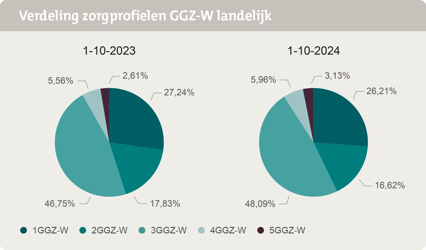 Tussen de periode 1 oktober 2023 en 1 oktober 2024 is in de regio een stijging van 15,7% (landelijk 8,3%) te zien in het aantal aanspraken tot de Wlz voor de profielreeks GGZ-W. Opvallend is de stijging van 1 GGZ-W profielen tussen de periode 1 oktober 2023 en 1 oktober 2024. In vergelijking is deze procentueel vier maar zo hoog dan landelijk.