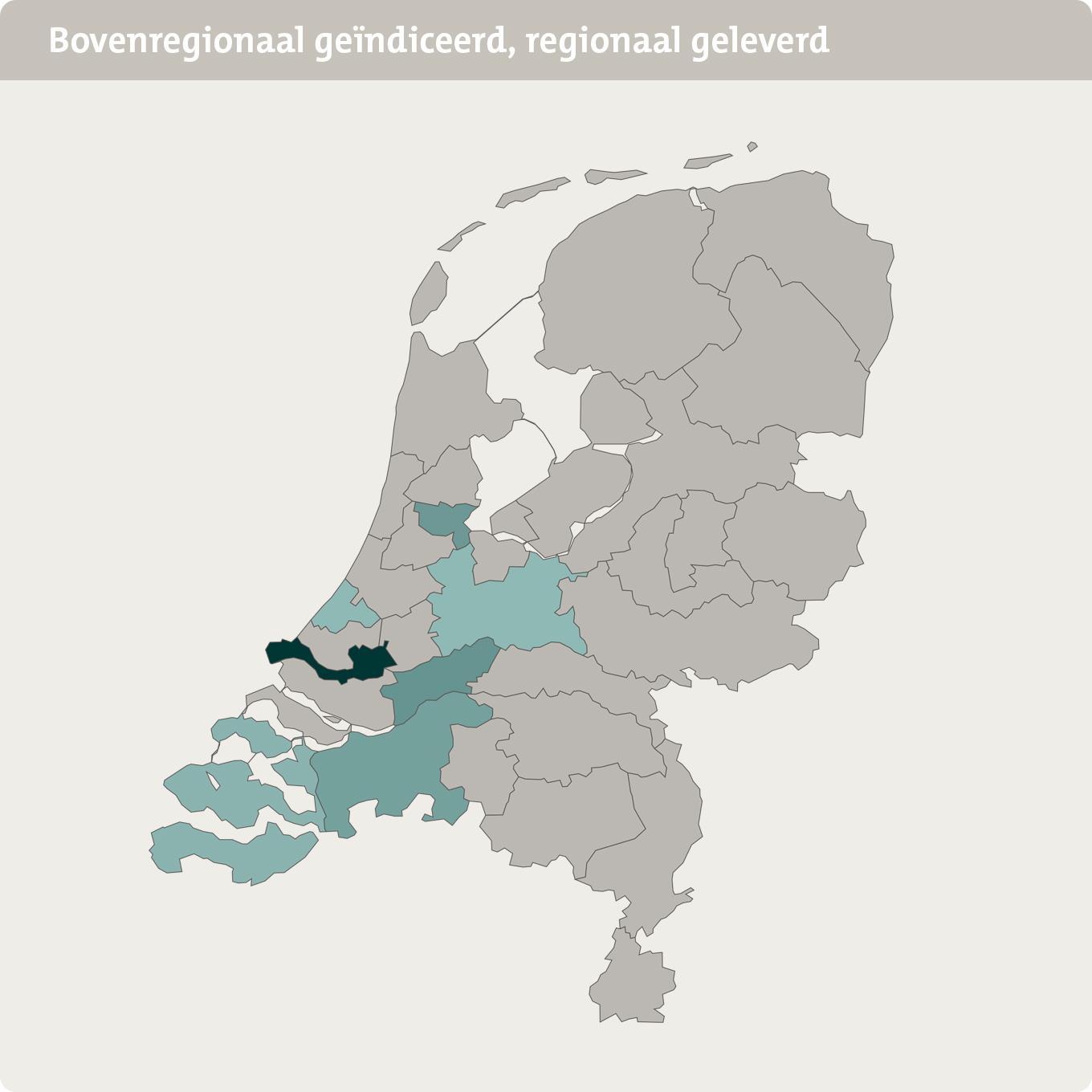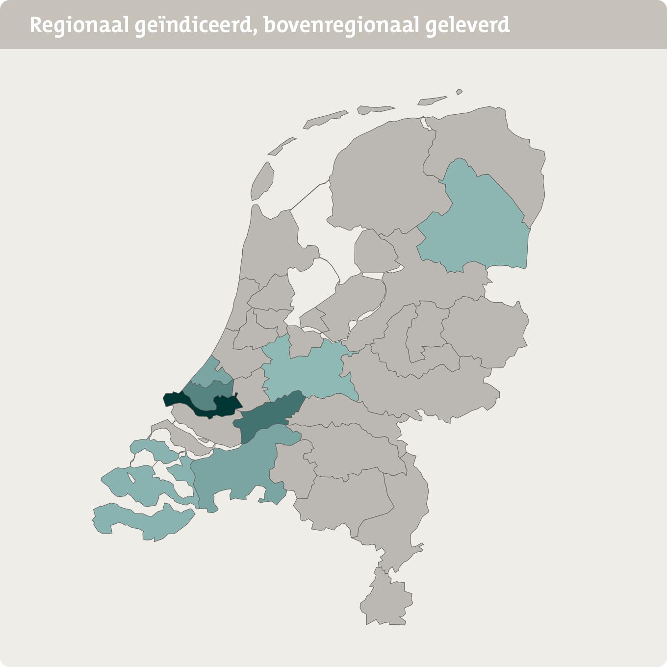 In 2024 zien we dat het aantal cliënten dat regionaal geïndiceerd werd en bovenregionaal zorg ontving, vergelijkbaar is met het voorgaande jaar. Deze bovenregionale zorg werd voornamelijk geleverd in de zorgkantoorregio Rotterdam. De meeste cliënten die bovenregionaal geïndiceerde waren en waarvoor de zorg werd geleverd in de regio Zuid-Hollandse eilanden, kwamen het vaakst uit de zorgkantoorregio’s Rotterdam en West-Brabant.