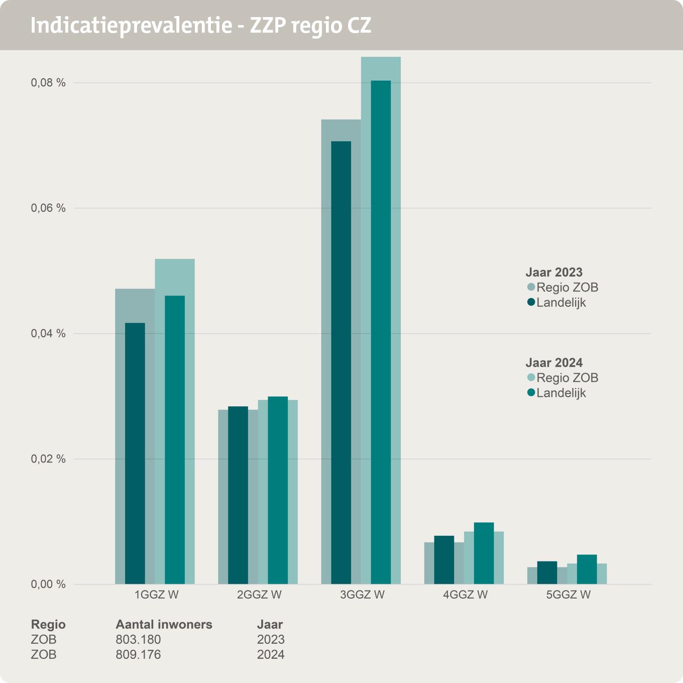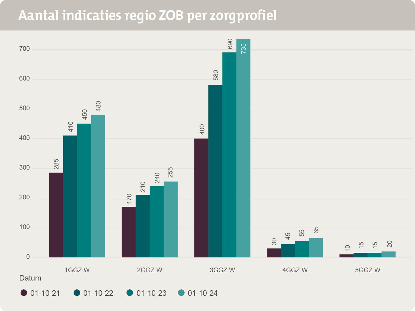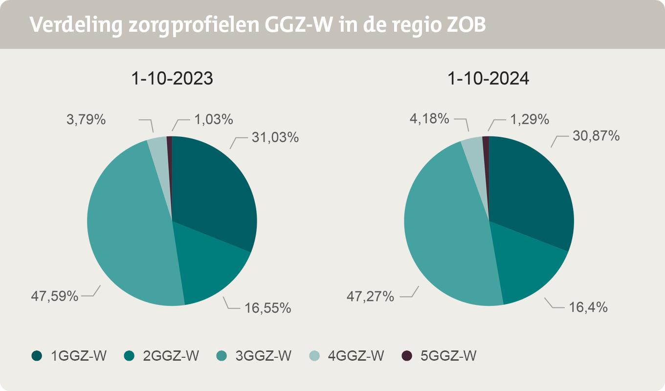 Tussen de periode 1 oktober 2023 en 1 oktober 2024 is in de regio een stijging van 7,2% (landelijk 8,3%) te zien in het aantal aanspraken tot de Wlz voor de profielreeks GGZ-W. De regio laat een stijging zien bij zowel de lage als hoge GGZ-W profielen.